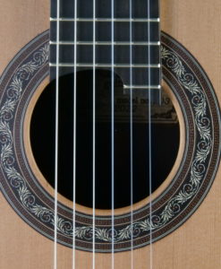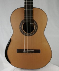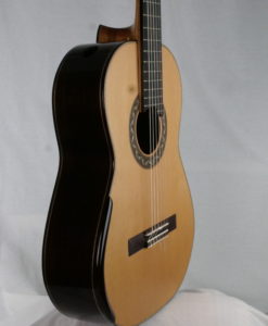 - Manche: cèdre espagnol renforcé avec de l’ébène épaisseur : 1ére fret – 21.5 mm 9e fret – 23 mm