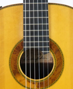 Christian Koehn est un luthier Allemand basé à Berlin qui fabrique des guitares traditionnelles sur-puissantes et des double-tables magnifiques. Christian a plusieurs années d’attente et ses guitares sont trés difficiles à obtenir.Voici une chance unique d’acquérir une guitare traditionnelle de Christian Koehn de 2016 en trés bonne état : puissance et sonorité cristallines. La guitare 2016 de Christian Koehn – luthier Berlinois – nous avait littéralement envoûtée avec sa puissance, une magnifique couleur sonore et ses innovations. Celle en cèdre de 2017 est sans doute meilleure. Ici on est en territoire connu avec un touché progressif et traditionnel mais avec une épaisseur sonore et un volume hors norme. La guitare offre une sonorité claire compensée par une table en épicéa qui ajoute apporte une certaine complexité sonore avec une belle richesse harmonique. La séparation des voix est excellente avec un halo harmonique présent en permanence. la lutherie magnifique.Les guitares de Christian Koehn sont de guitares classiques traditionnelles équipées d’une innovation inspirée des systèmes Bass-reflex qui l’on trouve dans les haut-parleurs et qui a pour but de répartir la charge de production sonore entre la table et l’évent. Le soundport / bass reflex system est localisé sur l’éclisse supérieure et un élégant couvercle peut-être aussi utilisé pour dissimulé l’ouverture. Un résultat époustouflant de beauté sonore avec puissance et rondeur !La table a été travaillée pour rééquilibrée le volume avec tout juste ce qu’il faut d’aigus et de médium. Aussi puissante qu’une double-table, cette guitare offre une sonorité chaleureuse avec une bonne épaisseur sonore dans les aigus et une très belle rondeur.La lutherie est magnifique avec un tour de table fait d’une marqueterie chevronnée et un magnifique palissandre indien en 3 pièces.