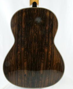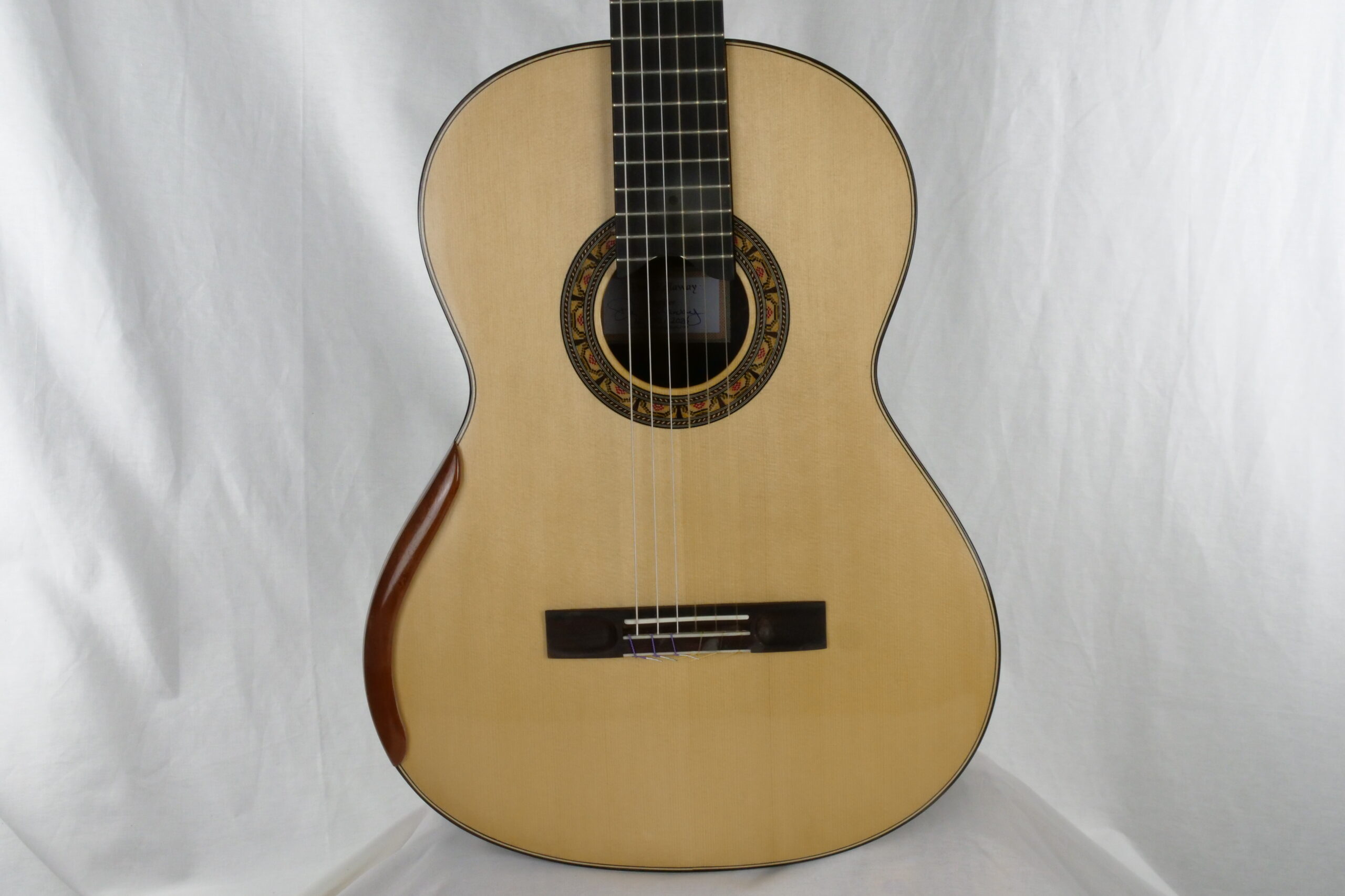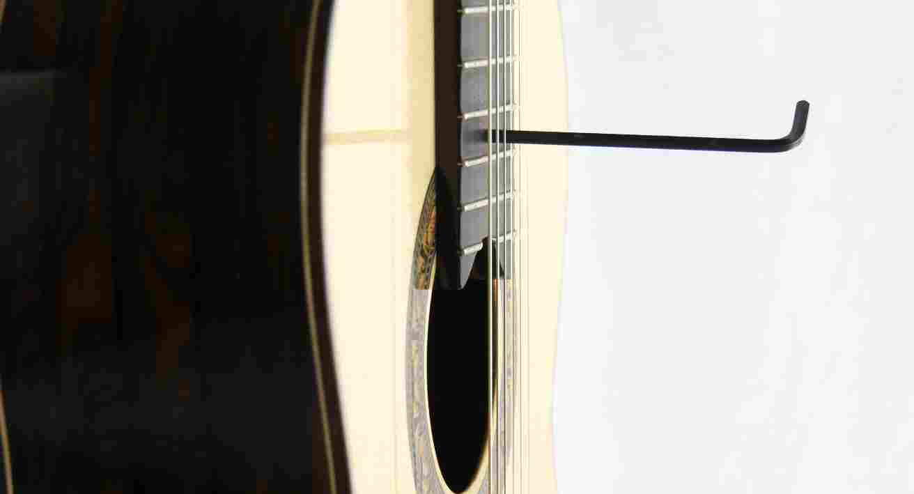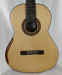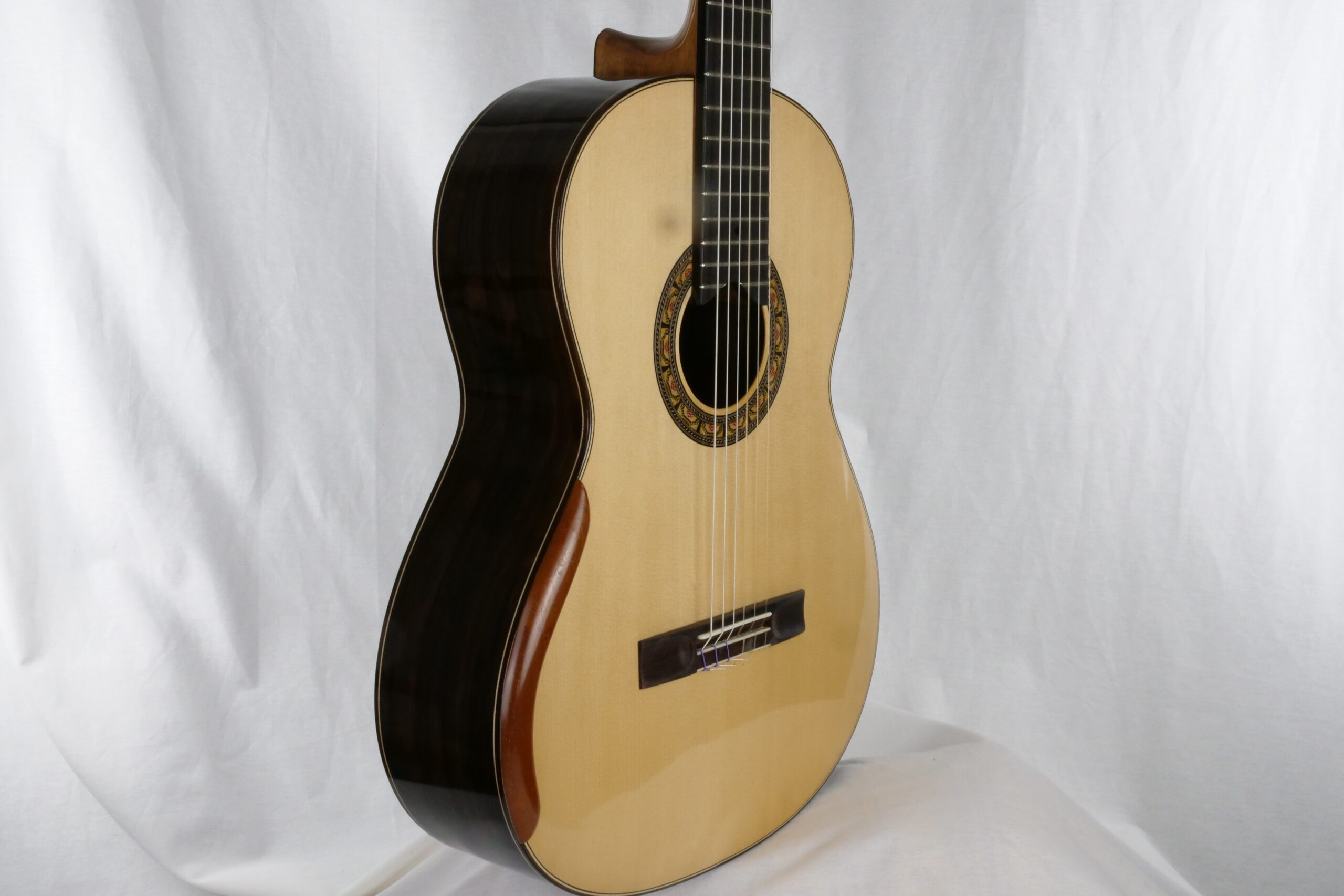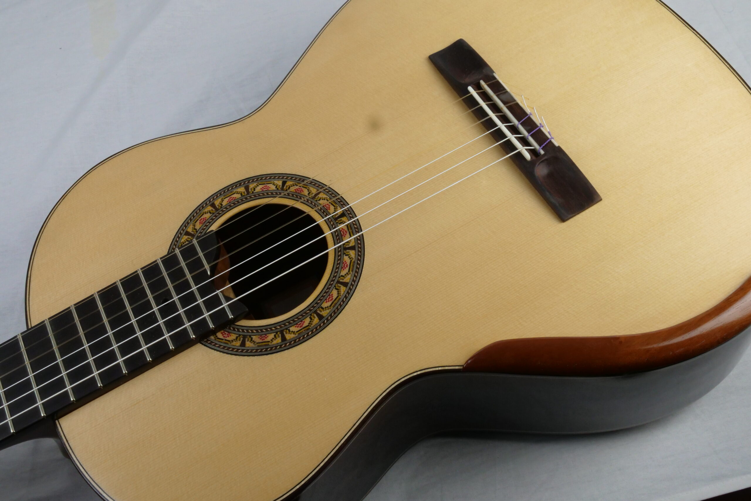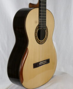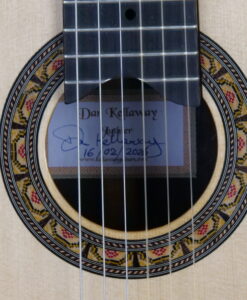 Cette guitare classique Dan Kellaway bénéficie d’une table très fine et d’un vernis fin. La puissance est la dynamique est celle des Smallman mais la couleur sonore d’une Simon Marty. Autrement dit, pour les connaisseurs avides de référence, on a les basses profondes d’une Greg Smallman & Sons et les aigus cristallins d’une Simon Marty. La guitare bénéficie du tout nouveau dispositif pour modifier la hauteur des cordes.
