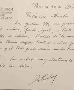 Les guitares de Daniel Friederich sont les guitares les plus recherchées du moment et malheureusement les prix s’envolent. L’histoire veut qu’ Alexandre Lagoya a décidé de commander sa Friederich après avoir essayé celle-ci. Daniel Friederich lui demanda alors de préciser sa demande: c’est assez simple répondit t’ il .. « Je veux une guitare exactement comme celle-ci ». La guitare est dans son jus avec des marques de jeux et pour une fois à un prix raisonnable qui prend en compte l’histoire de l’instrument. Mis à par cela, sûrement la meilleure Friederich que nous ayons jouée à ce jour.