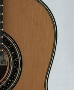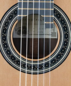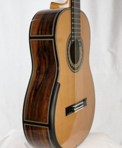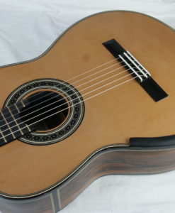 Mes guitares bénéficient d’un barrage en croissillon – lattice – mais sont en fait assez éloignées des guitares Australiennes. Le dos est traditionnel en bois massif et non en mélaminée ni bombé comme sur les guitares Australiennes afin que celui-ci puisse avoir un rôle actif. Les éclisses sont doublées pour réduire la perte d’énergie. La table est relativement épaisse avec des parties affinées. Le barrage a pour objet de produire un niveau sonore élevé et de conserver cette couleur chaleureuse des guitares Européennes. Mes guitares se caractérisent par des basses imposantes (basses d’un violoncelle), ronde et pleine avec une tenue de note impressionnantes. Les résonnances de la guitare sont entre 69hz et 168hz. Les sillets sillets en cuivre – qui décuplent le temps de travail – permettent de rehausser la qualité sonore.