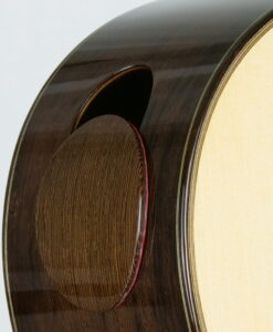 Douglass fabrique des guitares avec des aigus cristallins et une dynamique / amplitude sonore impressionnantes aptes à rivaliser avec les meilleures lattice ou double-tables. En résumé, cette guitare de Douglass Scott offre tout simplement une plus grande palette tonale, un sustain accru, des notes épaisses et des plus d’aigus. Pour cette guitare, nous avons demandé à Douglass d’intégrer un repose-bras, un soundport magnétique ajustable, des mécaniques Alessi et surtout une table en épicéa qui apporte une certaine complexité aux notes. Sans doute l’une des meilleures guitares traditionnelles canadiennes.