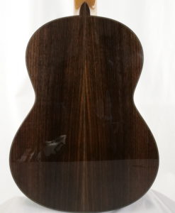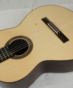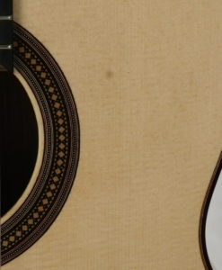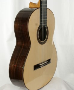 François Régis Léonard se démarque des luthiers Français qui restent somme toute assez traditionnels. Voici la dernière guitare de François Régis Léonard qui combine tradition et modernité avec une sonorité traditionnelle boostée par un barrage en croisillon sans carbone ni balsa qui confère à cette guitare une belle dynamique et épaisseur sonore. François-Régisa a modifié la structure de sa table pour donner à sa guitare une réponse plus pleine et plus charnue. Cette évolution est significative et fait de François Régis Léonard l’un des meilleurs luthiers Français d’aujourd’hui.