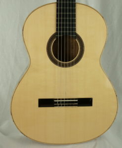 François Régis Léonard se démarque des luthiers Français qui restent somme toute assez traditionnels. Voici la dernière guitare de François Régis Léonard qui combine tradition et modernité avec une sonorité traditionnelle boostée par un barrage en croisillon sans carbone ni balsa qui confère à cette guitare une belle dynamique et épaisseur sonore. François-Régisa a modifié la structure de sa table pour donner à sa guitare une réponse plus pleine et plus charnue. Cette évolution est significative et fait de François Régis Léonard l’un des meilleurs luthiers Français d’aujourd’hui.