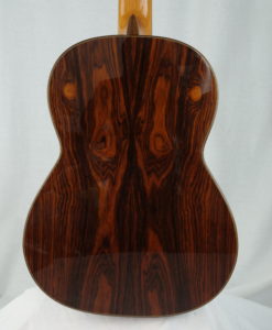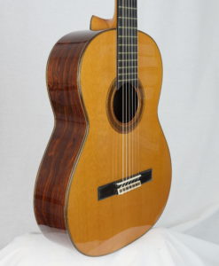 Jean-Luc Joie est un luthier réputé qui fabrique de magnifiques guitares de concert dites braceless – sans barrage – jouées par de grands concertistes comme Thibaut Cauvin. Jean-Luc Joie fabrique aussi des guitares ‘semi-concert’ basées sur le même principe mais à des tarifs plus abordables. Le modèle J (J comme Joie) de 2014 est l’une de ces guitares qui fonctionnent avec une table constituée d’une couche de bois collée à un matériau synthétique ultra léger mais hyper résistant qui permet de s’affranchir du barrage et donc de bénéficier d’une table hyper sonore – que l’on peut qualifier de double-tables avant l’heure- . Une occasion d’acquérir une occasion en état presque neuf qui procure la sensation des grandes guitares de concert d’aujourd’hui à un prix imbattable.