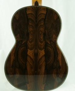 Cette guitare d’Andreas Kirmse est assez différente des double-tables allemandes. Ici la couleur sonore est résolument traditionnelle, il est impossible de deviner à l’écoute que c’est une double-table. Tout rappel la sonorité des grandes guitares allemandes, les basses sont puissantes et les aigus cristallins. Une certaine clarté permet à cette guitare de porter sa voix dans des trés grands espaces. Les réglages sont exceptionnels et la lutherie délicate.