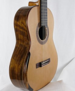 Andreas Madimenos est un guitariste luthier qui voue une admiration aux guitares de Greg Smallman & sons. Il s’est donc inspiré de certains éléments de la lutherie Australienne (dos et éclisses trés structurés, table fine, cadre intérieur, forme du barrage) tout en développant des éléments qui lui sont propres. Cette guitare a été réalisée en 2023 et a servi de benchmark et de point de comparaison dans son atelier avec les instruments fabriqués ensuite. Ce numéro 66 est donc maintenant en disponible pour le plus grand plaisir du futur acheteur.