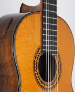 La table a été travaillée pour rééquilibrée le volume avec tout juste ce qu’il faut d’aigus et de médium. Aussi puissante qu’une double-table, cette guitare offre une sonorité chaleureuse avec une bonne épaisseur sonore dans les aigus et une très belle rondeur.