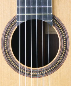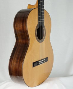 François Régis Léonard se démarque des luthiers Français qui restent somme toute assez traditionnels. Voici la dernière guitare de François Régis Léonard qui combine tradition et modernité avec une sonorité traditionnelle boostée par un barrage en croisillon sans carbone ni balsa qui confère à cette guitare une belle dynamique et épaisseur sonore. Que dire sur la lutherie sinon qu’elle est parfaite. A écoutez et découvrir absolument!