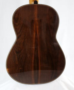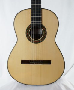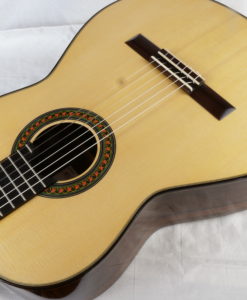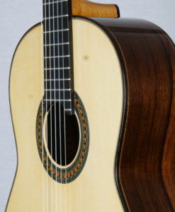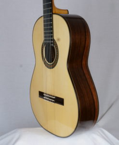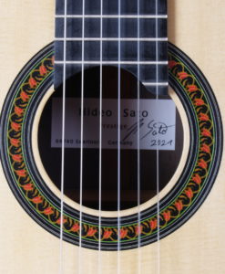 Cela faisait plus longtemps que nous souhaitions avoir une guitare d’un des jeunes luthiers les plus doués d’Allemagne : Hideo Sato. Hideo fabrique des guitares depuis plus de 10 ans dans l’atelier de son père. Les guitares de la famille Sato sont puissantes avec une sonorité traditionnelle. Les guitares d’Hideo sont trés proches de celles de Kazuo (même bois, même design, même outils) mais offrent cependant un peu plus de dynamique et une sonorité plus claires. Les basses sont profondes et les aigues généreux. Le modèle Prestige se différentie du modèle standard par le choix des bois qui contribuent à la qualité du son. Les guitares offrent donc les mêmes qualités que celles de son père avec une touche de modernité (dynamique)La famille des luthiers Sato (Kazuo et Hideo) est d’origine japonaise – installée depuis de longues années en Allemagne -. Kazuo a fait ses classes en Angleterre auprès du luthier David Rubio et fabrique depuis des des guitares de concert réputées pour l’élégance de la lutherie et leur qualité sonore.Si les guitares de la famille Sato devaient se positionner sur l’échiquier de la lutherie traditionnelle mondiale, sans hésiter, elles seraient dans une position comparable à celle d’un Daniel Friederich ou d’un Romanillos.Cette guitare Prestige d’Hideo, offre une sonorité est majestueuse et élégante, l’épicéa apporte de la séparation des voix et de la clarté mais reste toujours soyeux. Les basses sont rondes et puissantes. Nous connaissions les guitares de Kazuo des années 90 et 2000 (écoutez les ci-dessous), la Prestige de 2021 est assurément plus puissantes avec la même qualité sonore.