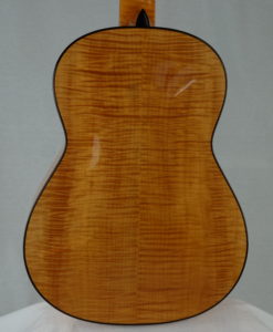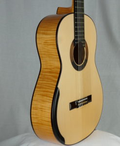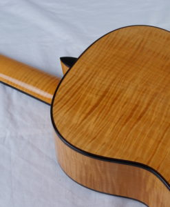Une fois n’est pas coutume, voici un modèle DELUXE de notre luthier Kim Lissarrague n° 383 qui offre un magnifique érable ondé pour le dos et les éclisses et une table en Epicéa. Le modèle Deluxe se différentie du modèle standard par une sélection accrue de bois dits ‘Master Grade’, des mécaniques haut de gamme Gotoh, une rosace Deluxe et un étui BAM. A part ce changement, l’on retrouve tout ce qui fait le charme des guitares de Kim : une sonorité lourde et épaisse qui confèrent une densité au discours musical et une dimension presque charnelle à cette guitare.Kim Lissarrague est un luthier que nous connaissons bien. Ses guitares ont été plébiscitées pas un grand nombre de guitaristes concertistes. Ses guitares classiques offrent un compromis entre la projection ‘Australienne’ Lattice et la sonorité classique traditionnelle. Nous avons demandé à Kim Lissarrague de revoir certains points et notamment son vernis qui est un vernis à l’eau qu’il utilise pour des raisons écologiques et de santé. Cette nouvelle guitare bénéficie d’un nouveau vernis nitrocellulose toujours à l’eau qui est plus résistant.Superbe projection, de la clarté et de la tenue, combinées à une sonorité pleine et riche en caractère. Les aigües sont clairs et fruités, les basses sont rondes et puissantes « impression violoncelle ». Paradoxalement brillant et souple.Une guitare d’exception à découvrir pour votre plus grand bonheur. Une référence et notre best -seller.A titre anecdotique la n° 140 a été achetée par un guitariste averti du sud de la France qui est allé faire en février une master classe à Portland avec .. Ana Vidovic. La surprise a été totale : pour le guitariste qui a pu jouer devant la belle Ana et aussi pour Ana Vidovic qui a découvert notre Lissarrague. Résultat: elle a testé notre instrument pendant plus d’une demi-heure.. sa Redgate faisait bien pâle figure dixit notre acheteur. Nous en sommes au numéro 281 ..Le confort de jeu est incroyable, facilité et souplesse sont au rendez-vous! Le galbe du manche est proche de la perfection même pour le guitariste le plus exigeant. La tenue de l’accord est impeccable, les mécaniques Gilbert sont non seulement belles mais aussi très efficaces. La guitare sonne sans aucun effort, riche en harmoniques, sa projection et sa dynamique sont fabuleuses sans agressivité avec une large palette sonore sous vos doigts. il faut les essayer pour se rendre-compte de la qualité d’un tel instrument.Une guitare impressionnante pour sa puissance et le fruité des ses aigues. Des basses époustouflantes et une facilité de jeu déconcertante.Un rapport qualité prix incroyable à comparer à des guitares vendues bien plus chers. Profondeur et chaleur… Grande musicalitéL’une de nos meilleures références en ce qui concerne la guitare australienne (Jim Redgate, Simon Marty, Greg Smallman, Zbigniew Gnatek, Paul Sheridan) et la guitare de concert tout simplement.