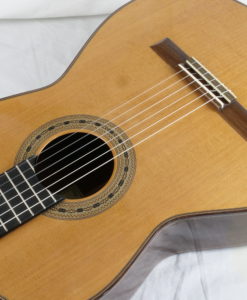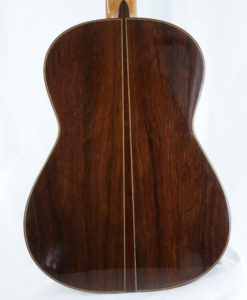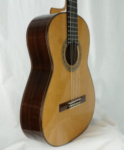Pour cette guitare 2025, nous avons sélectionné avec Mario Aracama un magnifique set de palissandre de Madagascar et une table en cèdre avec un barrage trés léger. L’épicéa précédemment reçue était magnifique, celle-ci avec sa table en cèdre est plus ouverte et offrent des résonnances à foison qui donnent une impression de puissance.