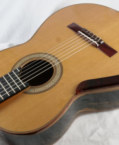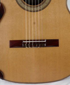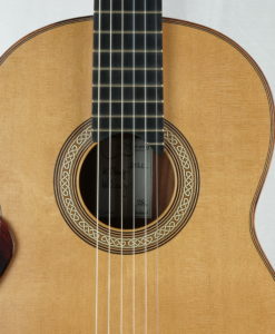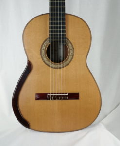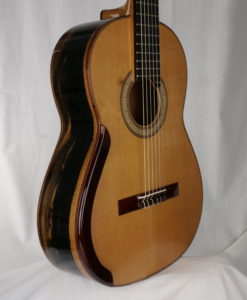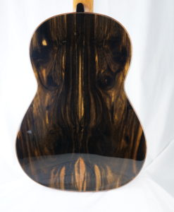 Les luthiers Irlandais Michael & Alec O’Leary sont une référence en matière de guitare classique de concert lattice. Si les australiens sont les maîtres du genre, Michael & Alec O’Leary n’en sont pas moins un référence de renom avec ses guitares classiques de concert jouées par des concertistes reconnues comme Berta Rojas, Sharon Isbin, Sergio Assad, David Russell, Marco Socias, Elefteria Kotzia et Elena Zucchini. Une preuve absolue de la qualité sonore de leurs guitares classiques. Michael et son fils fabrique en moyenne 9 guitares par an et ont environ deux années d’attente. Ils nous font l’honneur de nous fabriquer une guitare par an.Que dire à propos de cette n°245 de Michael et Alec O’Leary : la lutherie est exceptionnelle avec un choix de bois magnifique. Nous avons choisi pour le dos et les éclisses un magnifique ‘exotic Ebony’– Diospyros crassiflora Hiern-visuellement qui est entre le Ziricote et l’ébène de Makassar. La table en cèdre est parfaite. Pour ce No 245, nous avons demandé en option une touche sur-élevée qui a eu pour effet de modifier l’angle des cordes avec celui de la table et d’apporter un peu plus de rondeur et de puissance.En jouant cette guitare classique, on est avant tout frappé par la beauté de la sonorité – ni trop claire, ni trop sombre – avec une très grosse épaisseur sonore sans aucune connotation ‘lattice’.Les basses sont expressives à souhait sans être envahissantes. les aigus cristallins et fruités.Il y a quelque chose que l’on retrouve aussi dans les guitares de Simon Marty, une polyphonie incroyable et avec cependant des médiums élégants plus présents. Nous n’aurons qu’une seule guitare par an de Michael O’Leary c’est un honneur pour nous car Michael & Alec ont plusieurs années d’attente sur sa liste.Beaucoup de présence et beaucoup de musicalité et d’expressivité pour une guitare de grande lutherie.La guitare classique de Michael & Alec O’Leary est livrée dans un étui Hiscok.