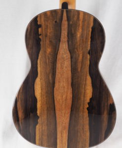 Que dire à propos de cette n°245 de Michael et Alec O’Leary : la lutherie est exceptionnelle avec un choix de bois magnifique. Nous avons choisi pour le dos et les éclisses un magnifique ‘exotic Ebony’– Diospyros crassiflora Hiern-visuellement qui est entre le Ziricote et l’ébène de Makassar. La table en cèdre est parfaite. Pour ce No 245, nous avons demandé en option une touche sur-élevée qui a eu pour effet de modifier l’angle des cordes avec celui de la table et d’apporter un peu plus de rondeur et de puissance.