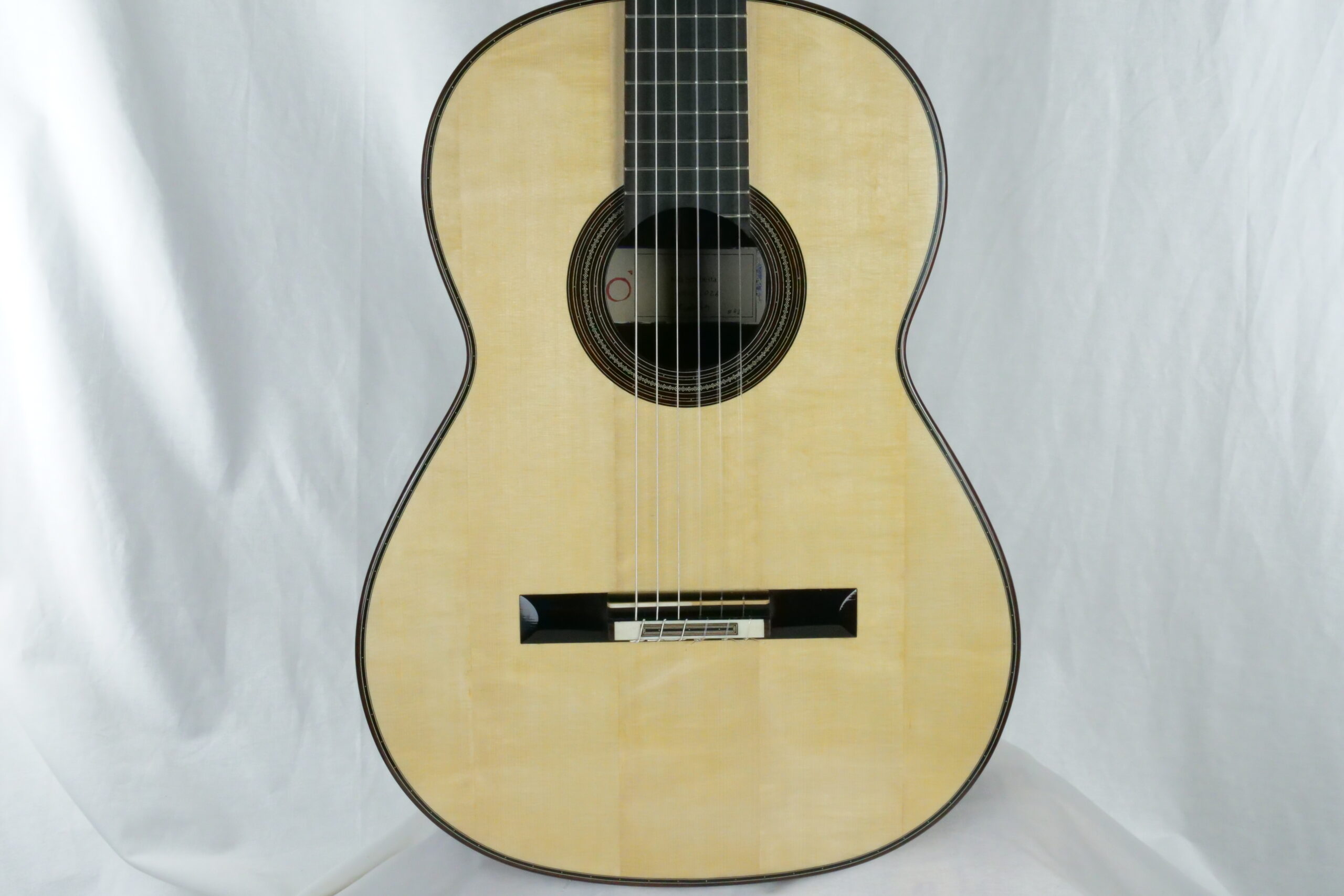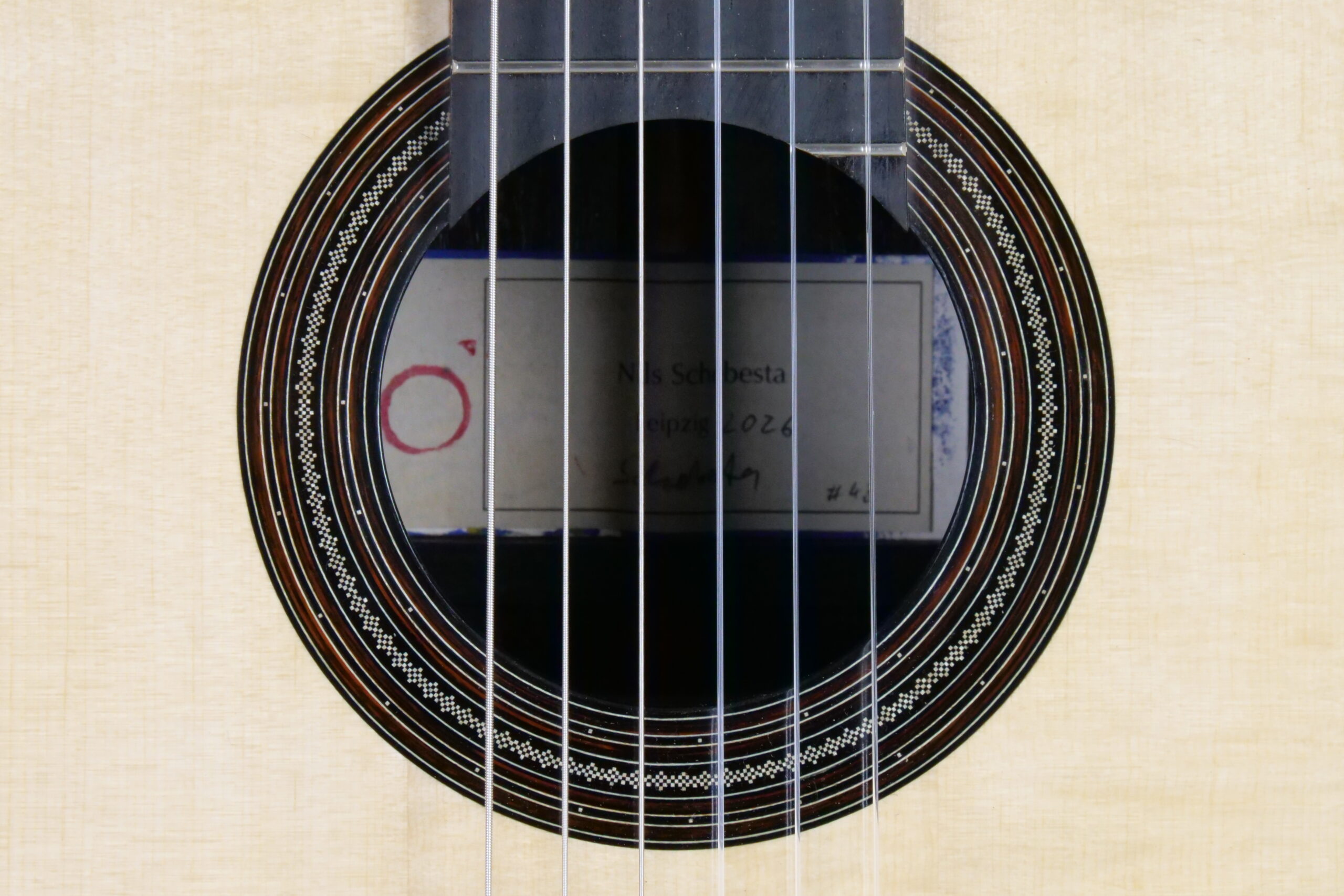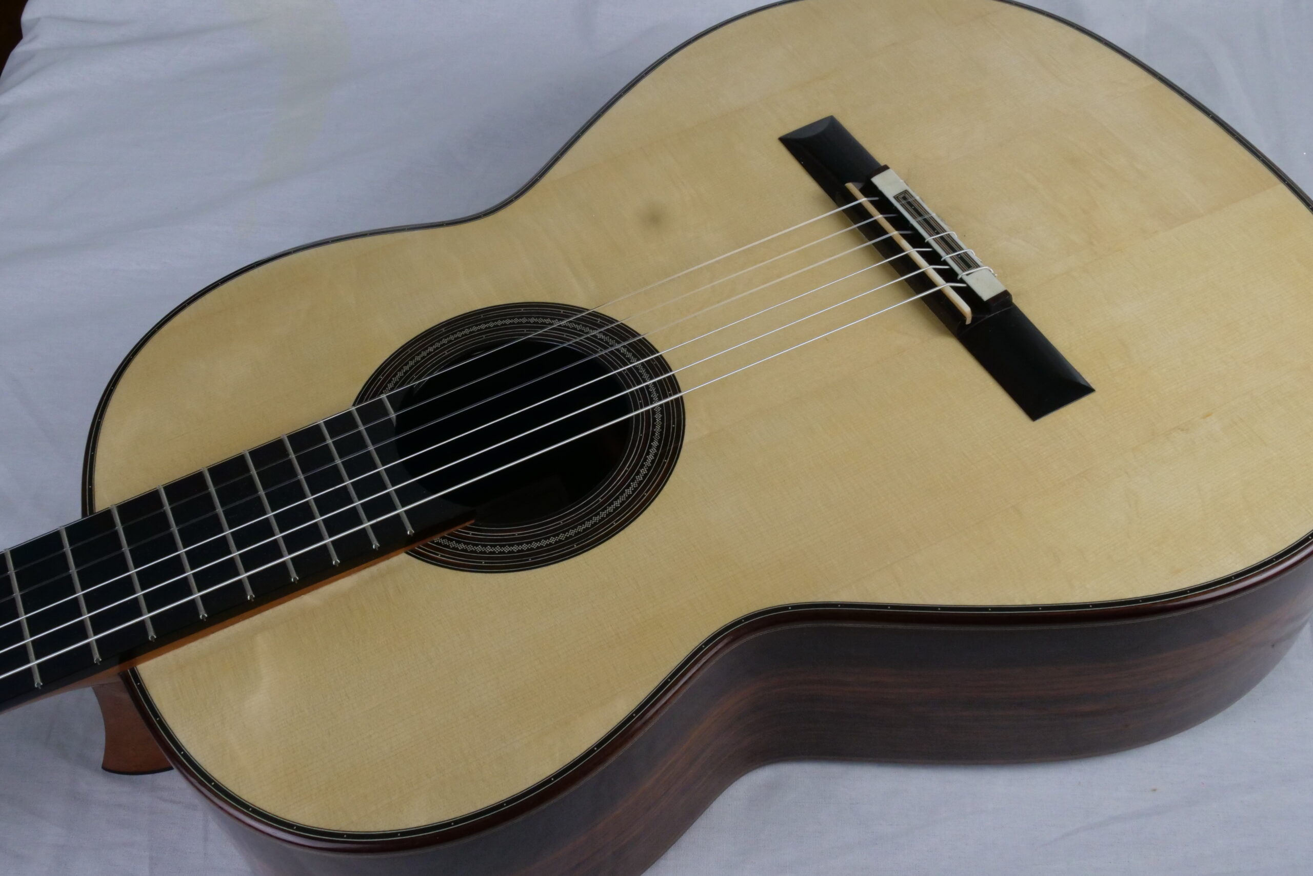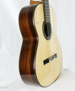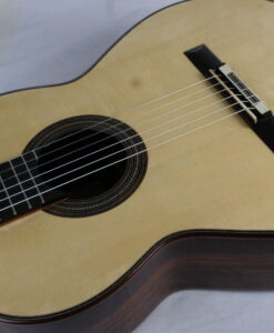 Nils Schebesta fait partie de la jeune génération de luthiers allemands pour qui le concept de double-table n’a plus de secrets. Ils sont familiers des grandes DT (Dammann, Wagner,..) qui sont devenues aujourd’hui des modèles et des sources d’inspiration. Pour cette DT n°43, Nils a choisi d’utiliser du nomex avec de l’épicéa et du cèdre et un corps hyper léger en palissandre indien. Ce qui surprend immédiatement, c’est la réactivité immédiate, une véritable explosion avec une épaisseur sonore et beaucoup de rondeur. La lutherie est impressionnante de détails avec des bois et notamment l’épicéa de la table de premier choix.