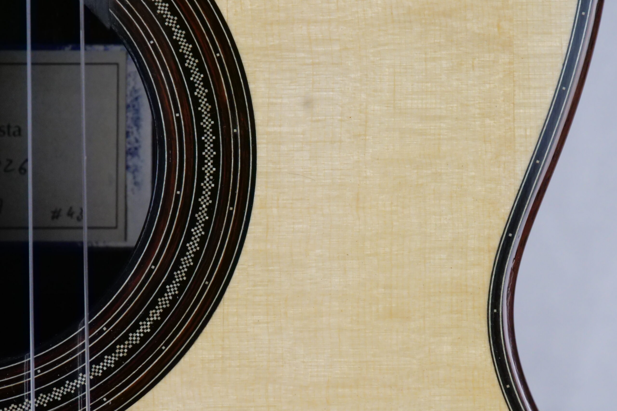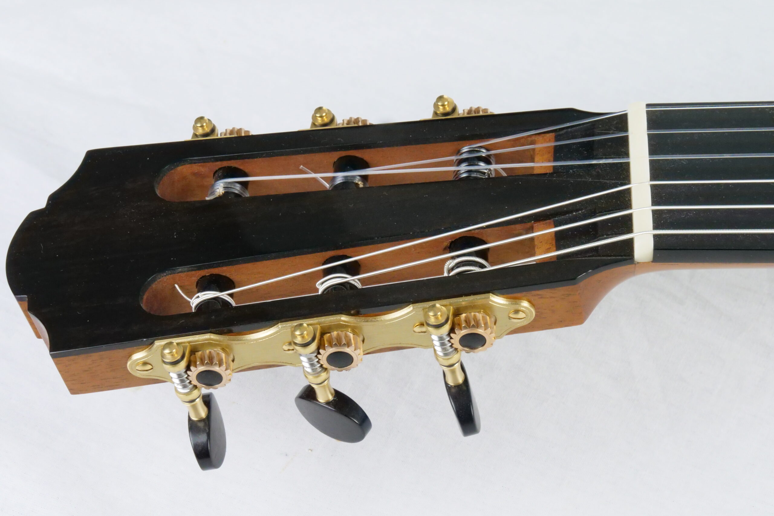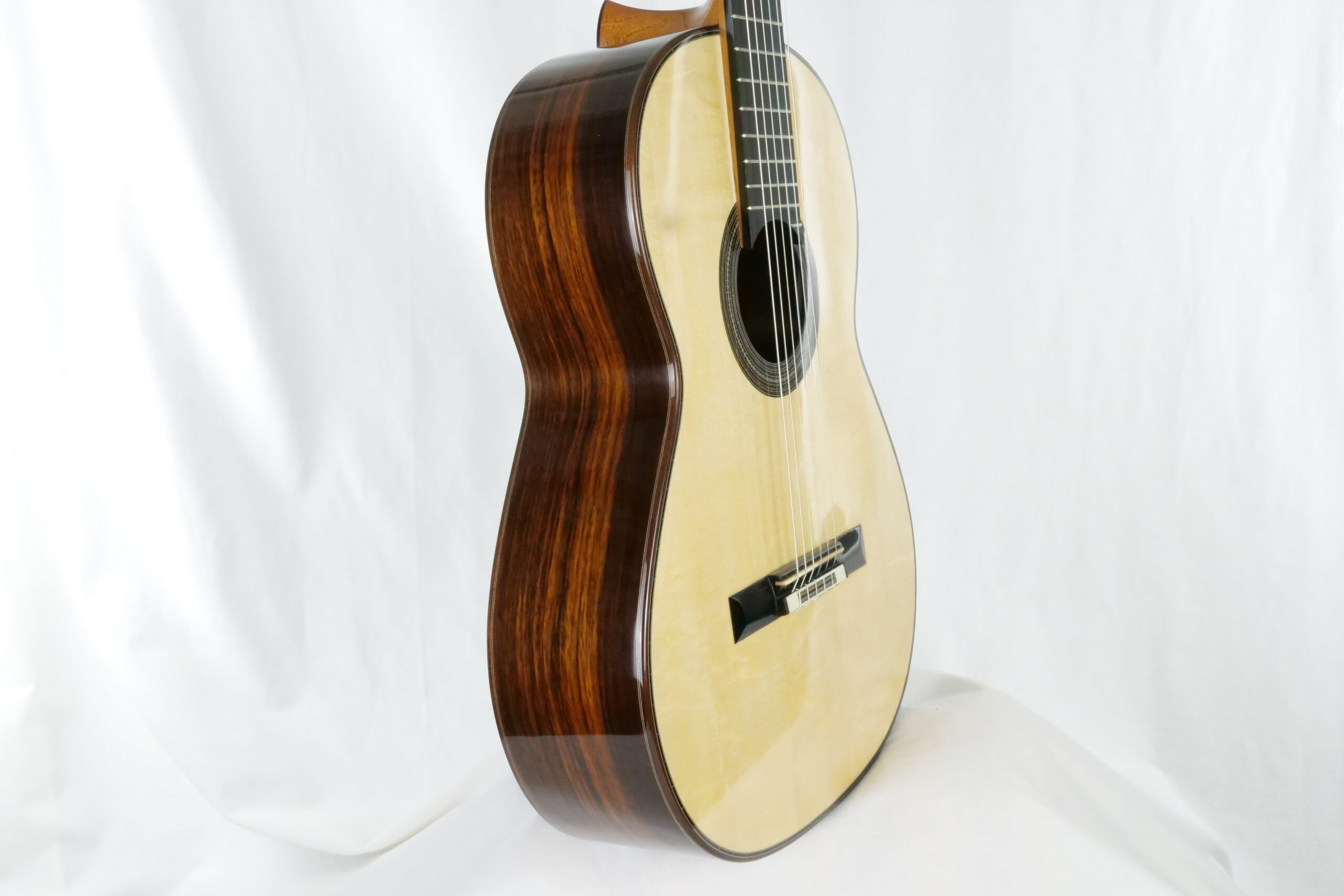 Nils Schebesta fait partie de la jeune génération de luthiers allemands pour qui le concept de double-table n’a plus de secrets. Ils sont familiers des grandes DT (Dammann, Wagner,..) qui sont devenues aujourd’hui des modèles et des sources d’inspiration. Pour cette DT n°43, Nils a choisi d’utiliser du nomex avec de l’épicéa et du cèdre et un corps hyper léger en palissandre indien. Ce qui surprend immédiatement, c’est la réactivité immédiate, une véritable explosion avec une épaisseur sonore et beaucoup de rondeur. La lutherie est impressionnante de détails avec des bois et notamment l’épicéa de la table de premier choix.