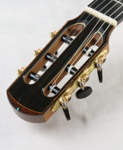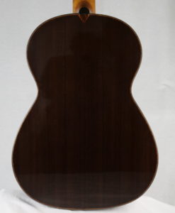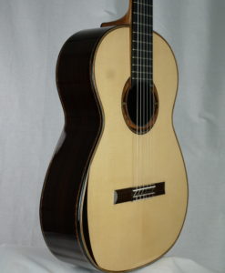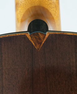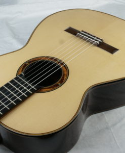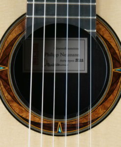 Voici la nouvelle guitare 2022 du luthier allemand Philipp Neumann – nous avons la chance d’avoir une Neumann par an. Cette édition 2022 est légèrement différente de celle de 2021 car Philipp a augmenté trés légèrement la taille des éclisses et la profondeur de la guitare afin de renforcer les basses. Le résultat est parfait. Cette guitare n’a de traditionnelle que son nom et sa sonorité : elle intègre une réflexion poussée sur la table d’harmonie. Celle-ci a pour objet de permettre à la guitare de rivaliser avec les guitares lattice et double-tables en matière de puissance tout en offrant une sonorité traditionnelle ample et majestueuse. La table en épicéa est creusée à l’intérieur pour accueillir des barres de renfort en épicéa qui viennent durcir la table sans pour cela l’alourdir. La lutherie est magnifique. Pour cette édition nous vous proposons une Neumann avec une table en épicéa. Un résultat époustouflant (regardez la revue vidéo), une meilleure définition sonore avec un long sustain ! La guitare a été vendue avant que nous ayons le temps d’enregistrer la revue détaillée par Philippe. Vous trouverez celle de la guitare de 2021 précédemment vendue l’année dernière.Philipp Neumann est un jeune luthier qui a fait ses classes en Allemagne à Leipzig où il a ouvert son atelier en 2004. Il a notamment fait ses classes chez le fameux luthier allemand Stephan Schlemper.C’est au détour d’un salon de lutherie en Belgique que nous avons découvert Philipp Neumann où maintenant il réside. Ces guitares nous ont tout de suite plu de par la qualité sonore trés traditionnelle avec cependant une amplitude et une flexibilité sonore hors du commun. La qualité de jeu est exceptionnelle avec une notion de plaisir impressionnante due à l’épaisseur sonore des notes et l’amplitude en matière de puissance.Une fois n’est pas coutume, nous avons demandé donc au luthier allemand Philipp Neumann de nous fabriquer une guitare pour le showroom. Cette guitare de concert n’a de traditionnelle que son nom : elle intègre une réflexion poussée sur la nature de la table . Celle-ci a pour objet de permettre à la guitare de rivaliser avec les guitares lattice et double-tables en matière de puissance tout en offrant une sonorité traditionnelle ample et majestueuse en conservant une certaine épaisseur et son caractère boisé. La table en cèdre est creusée à l’intérieur pour accueillir des barres de renfort en cèdre qui viennent durcir la table sans pour cela l’alourdir. La table est en effet creusée à l’intérieur et héberge plusieurs barres de cèdre qui viennent raidir la table et la renforcer sans ajouter de poids. Ensuite l’on trouve un barrage traditionnel.Le renforcement de la table ainsi durci permet d’amplifier les vibrations et le rendu sonore.La lutherie est exemplaire comme le montre la rosace qui incorpore de pierres de malachite. La sonorité est résolument ouverte avec un sustain sur toute les notes , des basses profondes et des aigus cristallins. La table en cèdre rééquilibre cette guitare en ajoutant de beaux médium.A découvrir au plus vite !