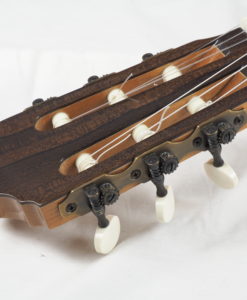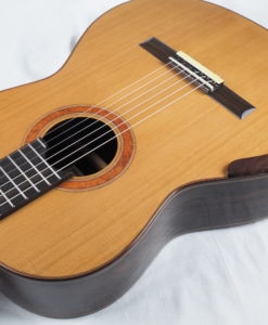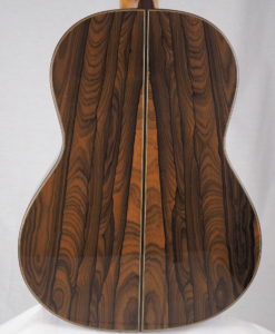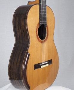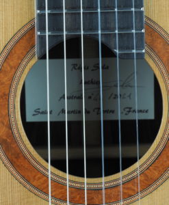 Régis Sala est un luthier trés représentatif de l’école de lutherie Française. Il a été formé en travaillant avec sur les guitares des grands luthiers de notre époque – Dominique Field, Daniel Friederich. C’est donc avec une démarche toute à fait personnel que Régis fabrique des guitares lattice. L’idée est de conserver la qualité sonore de la lutherie ‘Françaises’ tout en bénéficiant de l’apport de la lutherie Australienne. Son modèle Australe est donc un mixte d’une lutherie traditionnelle française et de la lutherie Australienne. Ce numéro 44 est en bois massif – ici un magnifique Ziricote – donc comme une guitare traditionnelle et la table est assez épaisse – trés éloignée de certaines tables Australiennes hyper fines -. Cependant le barrage est en quadrillage et nouveauté pour cette guitare, il est en balsa avec du carbone pour le renforcer.