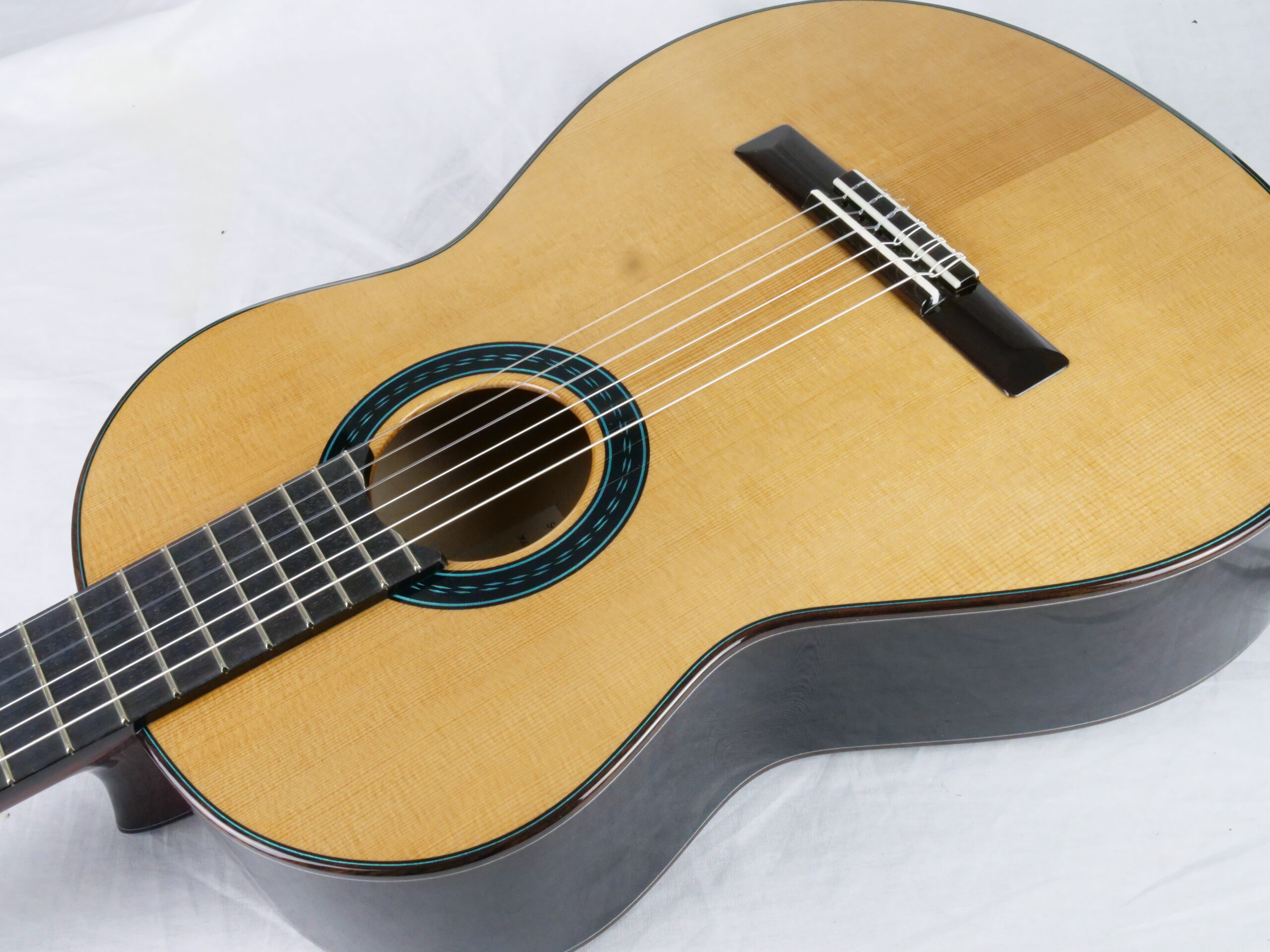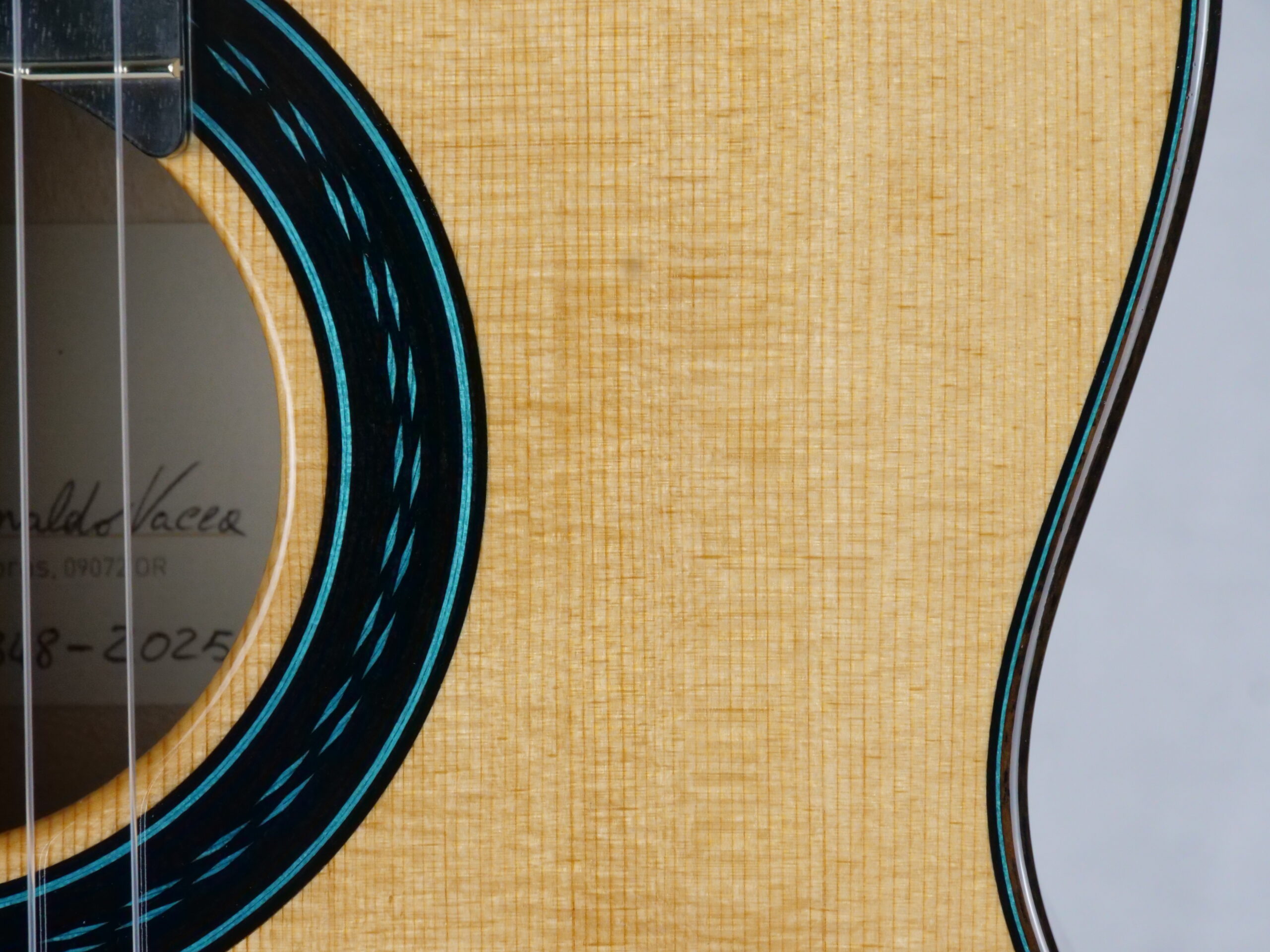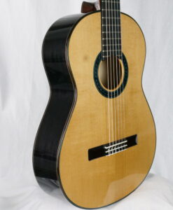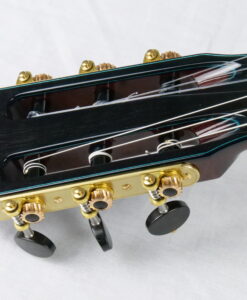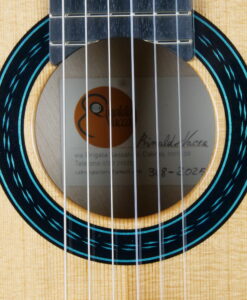 Le résultat est purement fantastique, puissance et épaisseur sonore avec des sonorités cristallines. Regardez la tête, elle est de toute beauté. Les guitares des Rinaldo Vacca sont construites avec un barrage en croisillons (lattice), en utilisant du cèdre et non du balsa, et sans l’utilisation de carbone. Les éclisses sont en trois couches, le dos en deux couches laminées d’érable, pour le manche cèdre ou acajou . La touche est en Blackwood tek. Le vernis est un vernis l’acrylique et les mécaniques Exagon avec un design personnalisé.