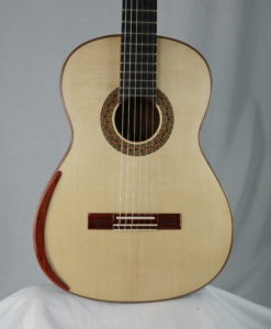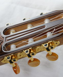 Cette nouvelle guitare N° 178 , est une double-table utilisant du Nomex ce qui est une nouveauté pour Vasilis depuis la numéro 170. Résultat : la guitare a gagné en dynamique avec plus de puissance, sustain et résonnances harmoniques. On retrouve ce qui fait la marque de Vasilis : une sonorité ronde et chaleureuse. Une lutherie de grande classe et une belle sonorité comme à l’accoutumé ! Vasilis mesure au niveau sonore tous les éléments de la construction pour arriver à la bonne fréquence. La revue vidéo de cette DT Nomex sera disponible mi novembre. La lutherie avec ses filets et sa tête gravée fait penser à la grande lutherie espagnole des temps passés. Le réglage est parfait. Voici quelques éléments d’information sur les guitares de Vasilis :