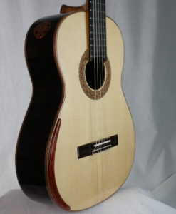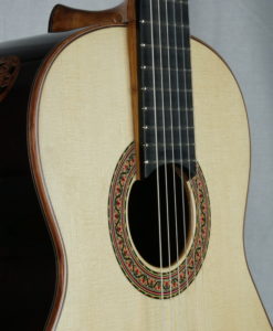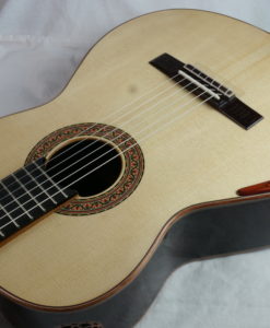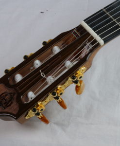 Cette nouvelle guitare N° 182, est une double-table utilisant du Nomex ce qui est une nouveauté pour Vasilis depuis la numéro 170. Résultat : la guitare a gagné en dynamique avec plus de puissance, sustain et résonnances harmoniques. On retrouve ce qui fait la marque de Vasilis : une sonorité ronde et chaleureuse. Une lutherie de grande classe et une belle sonorité comme à l’accoutumé ! Vasilis mesure au niveau sonore tous les éléments de la construction pour arriver à la bonne fréquence. La revue vidéo de cette DT Nomex sera disponible mi novembre. La lutherie avec ses filets et sa tête gravée fait penser à la grande lutherie espagnole des temps passés. Le réglage est parfait. Voici quelques éléments d’information sur les guitares de Vasilis :