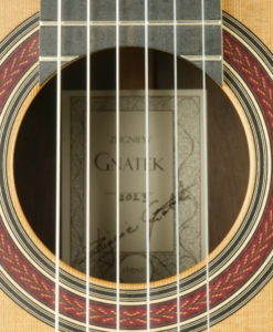 De conception très différentes d’une Smallman, ses guitares classiques sont légères et présentent des caractéristiques uniques : des grosses basses très profondes qui complètent des aigus relativement clairs.De manière générale, les guitares classiques ont soit un caractère sombre, timbré – une couleur cèdre diront certains – soit un caractère brillant et clair – typique de l’épicéa.Les guitares classiques de Zibgniew sont uniques en leur genre. Elles sont aussi puissantes qu’une Smallman et surtout offrent des basses très profondes, qui vont chercher bas dans le registre .. et des aigus qui tirent vers le brillant et la clarté. Le résultat est spectaculaire: les basses offrent un soutien harmonique solide et les aigus se détachent et transpercent l’espace. Les résonances harmoniques sont là pour épaissir le son. L’accord parfait!Zbigniew Gnatek est un trés bon guitariste ancien concertiste. Il a conçu une guitare classique pour répondre à ses exigences de musicien et le résultat est une guitare classique lattice très légère à l’opposé en terme de lutherie des Smallman mais avec une puissance et une musicalité exceptionnelle.Les basses sont profondes et puissantes et les aigus avec une pointe de brillance sont cristallins. La prise en main de l’instrument est surprenante de facilité avec une impression que toute la guitare classique vibre littéralement.Zbigniew fabrique très peu de guitares classiques de concert et a une longue liste d’attente. Il est conseillé de réserver son instrument. Nous aurons cette année exceptionnellement deux guitares classiques du luthier Gnatek. Sans aucun doute, elles seront réservées avant leurs arrivées, n’attendez pas pour nous contacter.