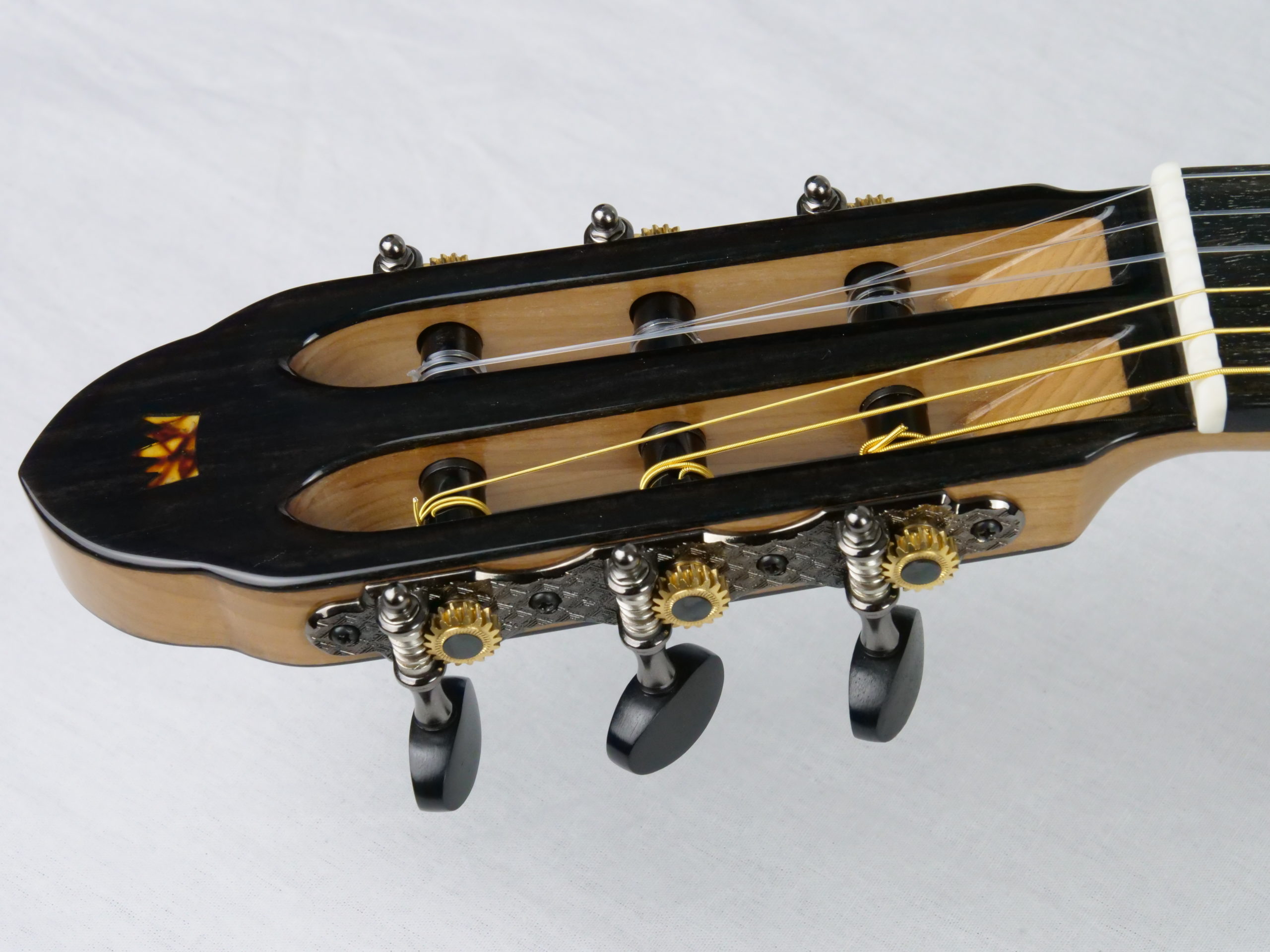 - Plaquage de la tête en ébène d’Afrique et incrustation en Ambre de la Baltique
