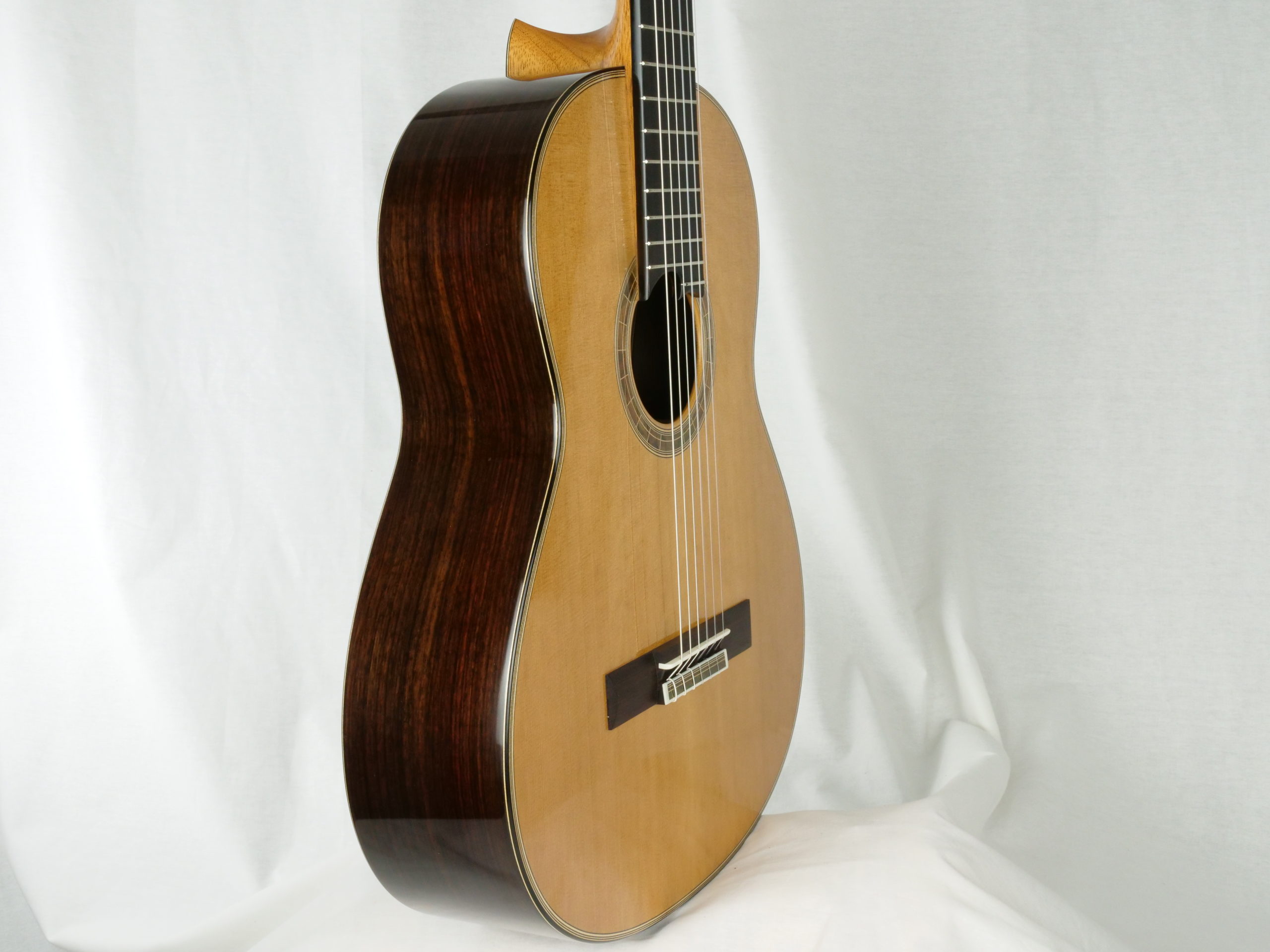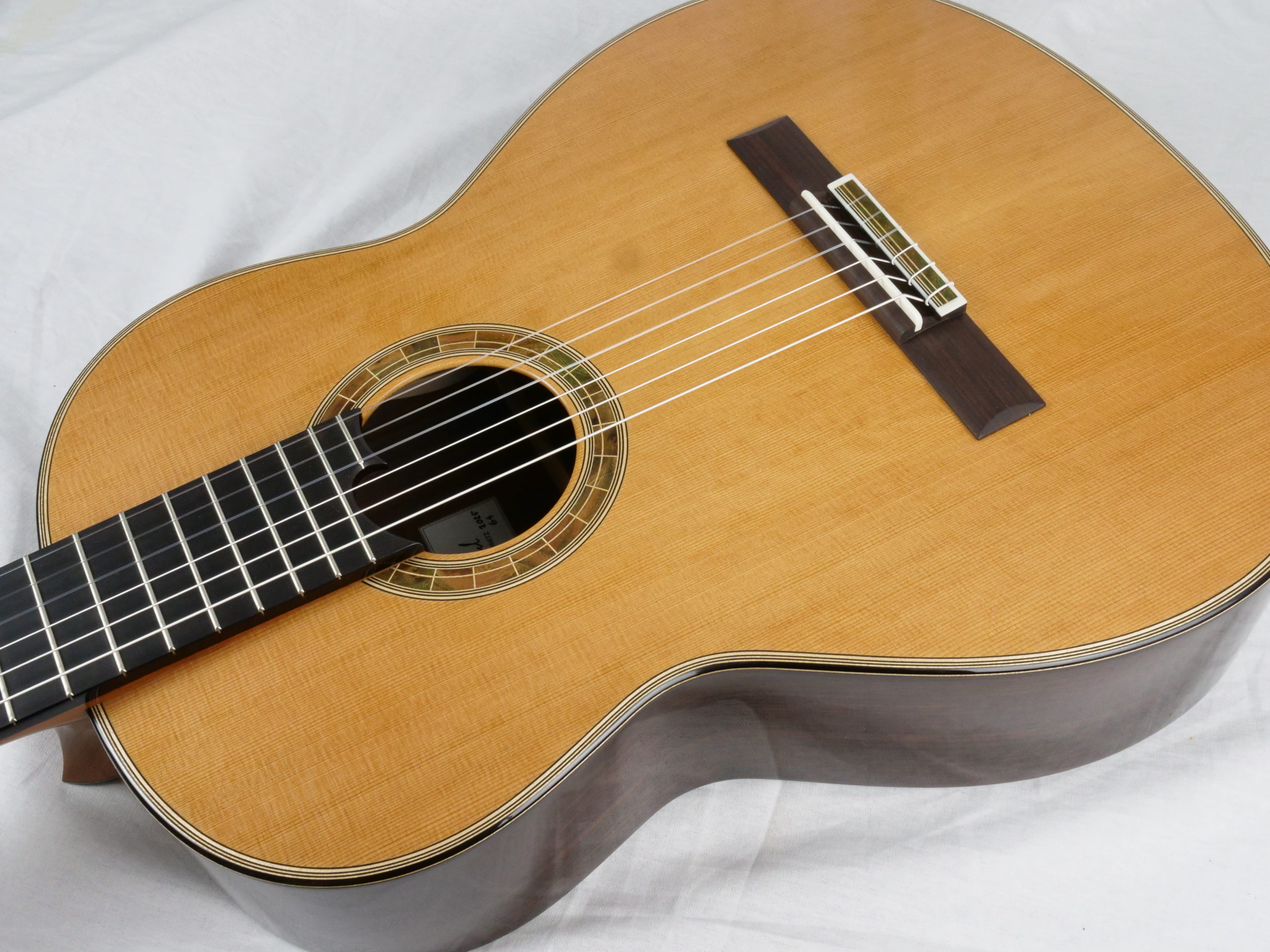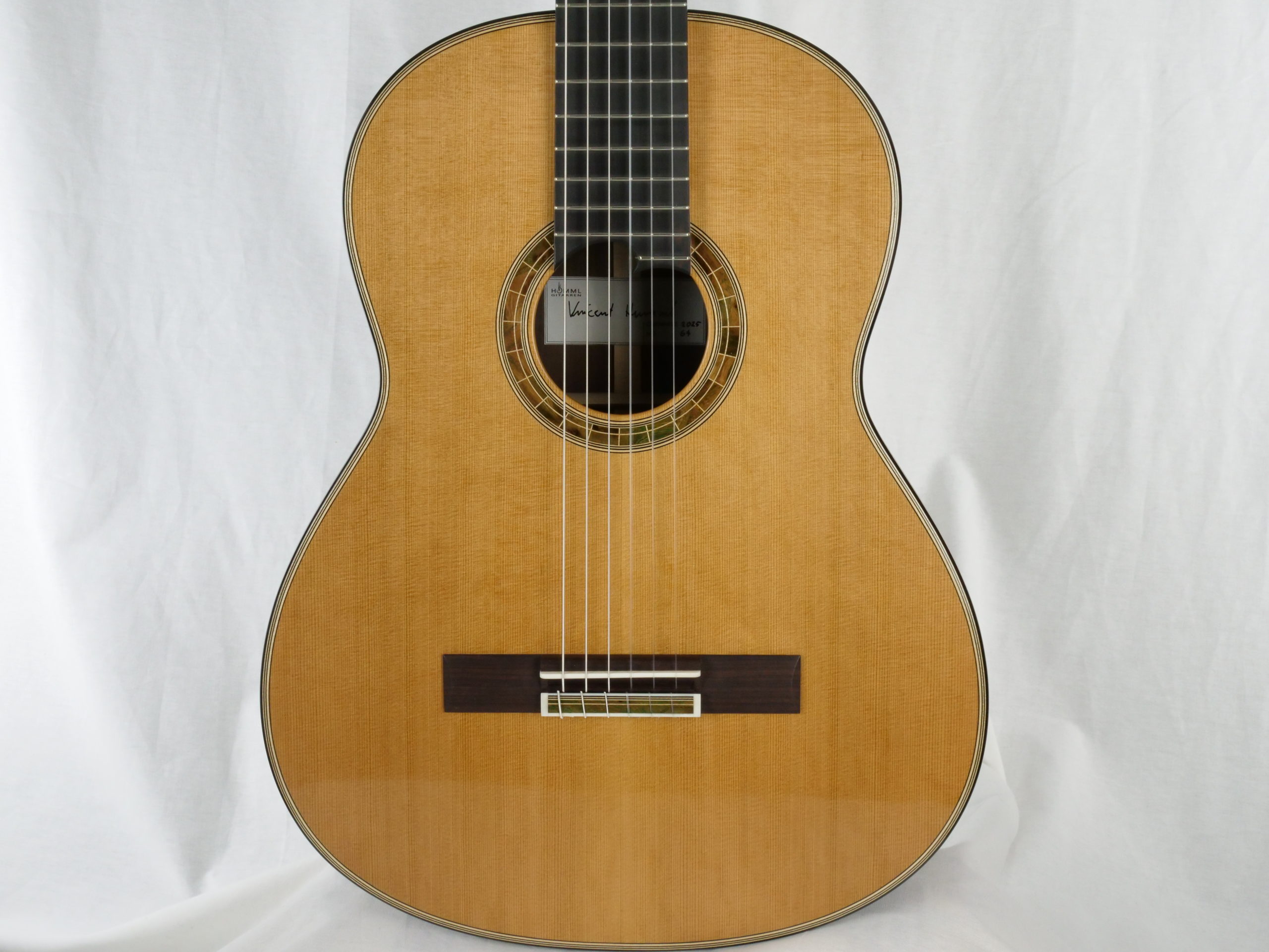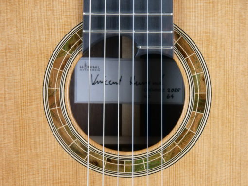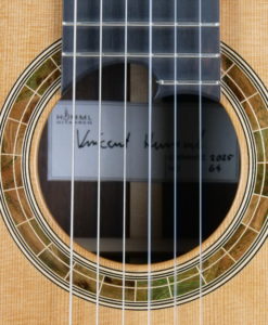 Pour ne rien gâcher, la lutherie est tout simplement merveilleuse avec une rosace et des incrustations d’une grande élégance.Le réglage est parfait. Voici quelques éléments d’information sur les guitares de Vincent :
